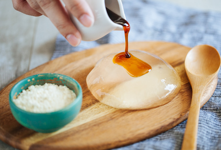 Gula merah cair atau gula jawa yang dibuat menjadi cair; Setelah semua merata, masukkan mentega yang kamu udah lelehkan. Berbentuk bulat dan transparan, kamu bahkan bisa melihat piring yang dipakai menyajikan mochi ini.